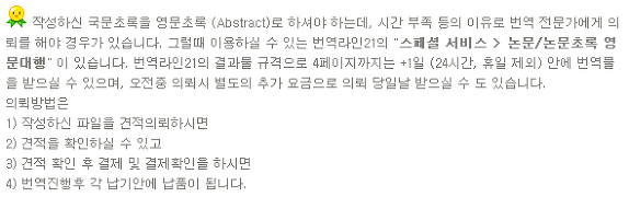 3) 영어사전은 물론, 구글,네이버 등에서도 검색이 안되는 용어가 많이 나오는 영문초록 번역의 경우 연구자 본인 영문초록의 품질 향상을 위해 그 논문을 가장 잘 아는 연구자 본인이 영어 용어를 제공해 주시는 것이 좋습니다. 이러한 검색이 어려운 용어가 많이 나오는 초록번역에서 용어가 제공되지 않으면 그 만큼 시간도 많이 걸릴 뿐더러 그 부분에 맞는 정확한 용어 사용을 보장하기 어렵습니다. 그리고 번역라인21의 스페셜서비스 논문/논문초록 영문대행1을 이용시, 관련 논문 용어를 10개이상 제공시 단가의 할인이 있습니다. 번역라인21 이용 고객의 추천 또는 2건 이상을 한번에 의뢰시에도 동일 할인이 적용됩니다.