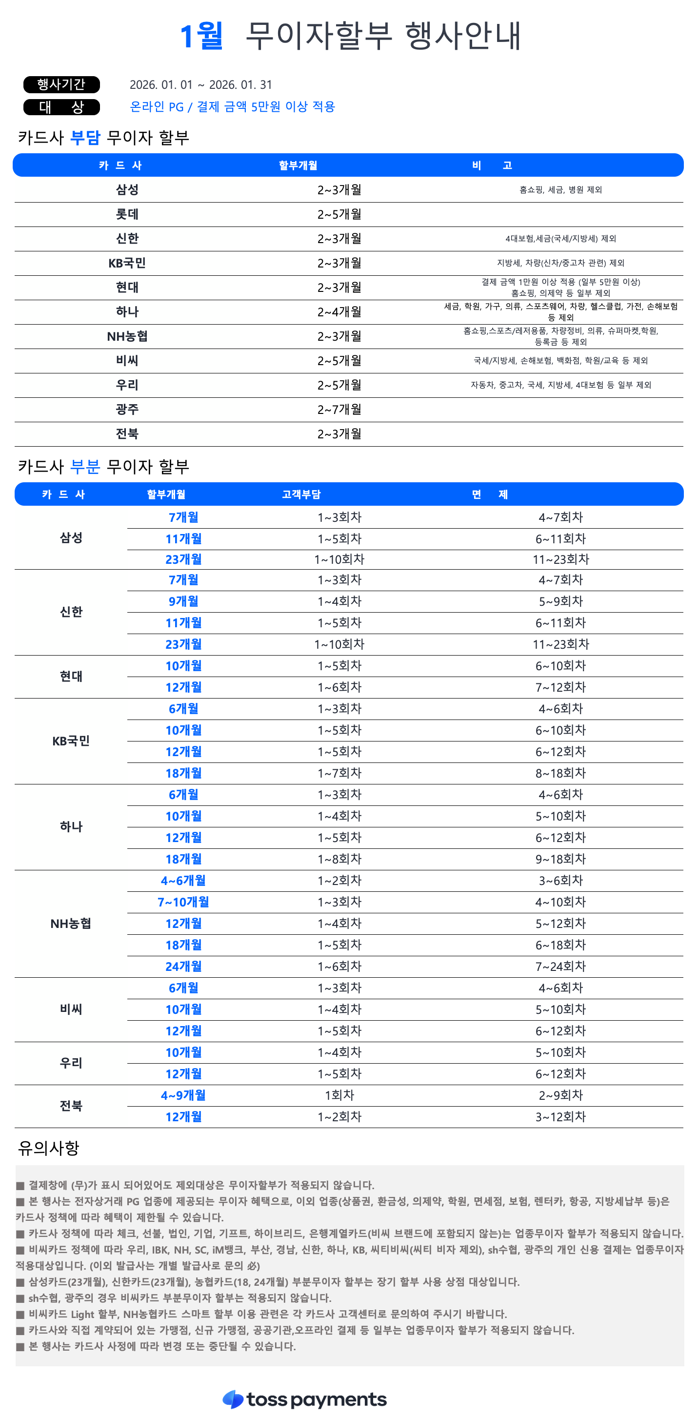 ⚠️ 주의: 각 카드사별로 세금, 보험, 가전, 병원 등 업종에 따라 무이자 적용이 제외될 수 있으니 상세 내용을 꼭 확인하세요!